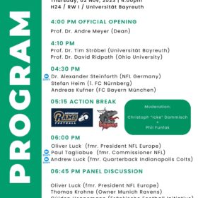 On November 2nd, the first AMERICAN FOOTBALL SUMMIT will take place at our faculty. We welcome international speakers with whom we can talk about American Football in Germany and the future strategy of the National Football League in Europe.