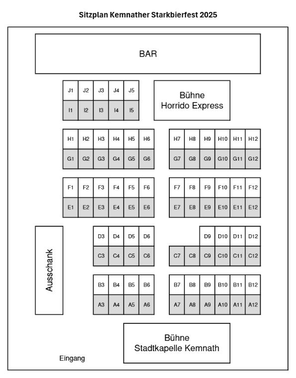 Auf unserer Ticket-Website können Sie Eintrittskarten erwerben und Ihren Wunschplatz direkt am übersichtlichen Sitzplan auswählen. Ob in direkter Nähe zur Bühne, in gemütlicher Tischrunde oder an der Bar – sichern Sie sich jetzt Ihre Plätze für ein einzigartiges Starkbiererlebnis in Kemnath!