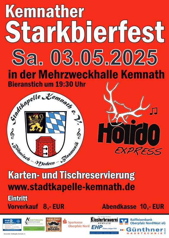 Am Samstag, den 03. Mai 2025, lädt die Stadtkapelle Kemnath zum traditionellen Kemnather Starkbierfest in die Mehrzweckhalle Kemnath ein. Ab 19:30 Uhr beginnt der offizielle Bieranstich, bevor Sie die StadtKapelle Kemnath mit in Feststimmung versetzt. Später heizt die Band Horrido Express die Stimmung weiter an und sorgt für einen unvergesslichen Abend voller mitreißender Live-Musik.
