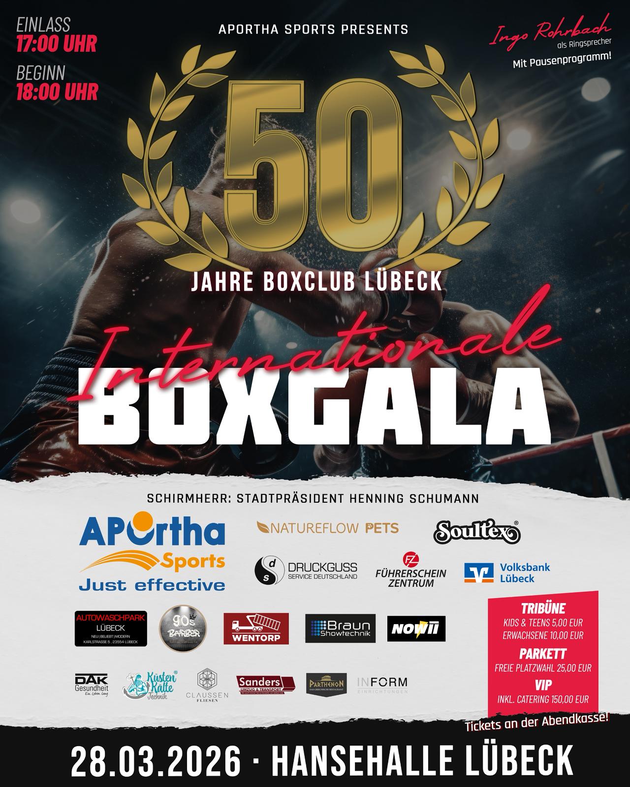 Erlebt ein Stück Lübecker Sportgeschichte live! Der Boxclub Lübeck feiert sein 50-jähriges Bestehen mit einer internationalen Boxgala der Extraklasse. Nach unserem grandiosen Rekord von 1.600 Zuschauern wollen wir nun gemeinsam mit euch die Hansehalle zum Beben bringen und die magische Marke von 2.000 Fans knacken.